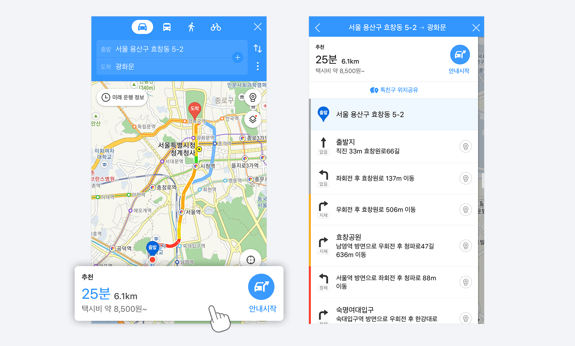 도착지만 입력하면 길찾기 완료라니 참 편리하죠?