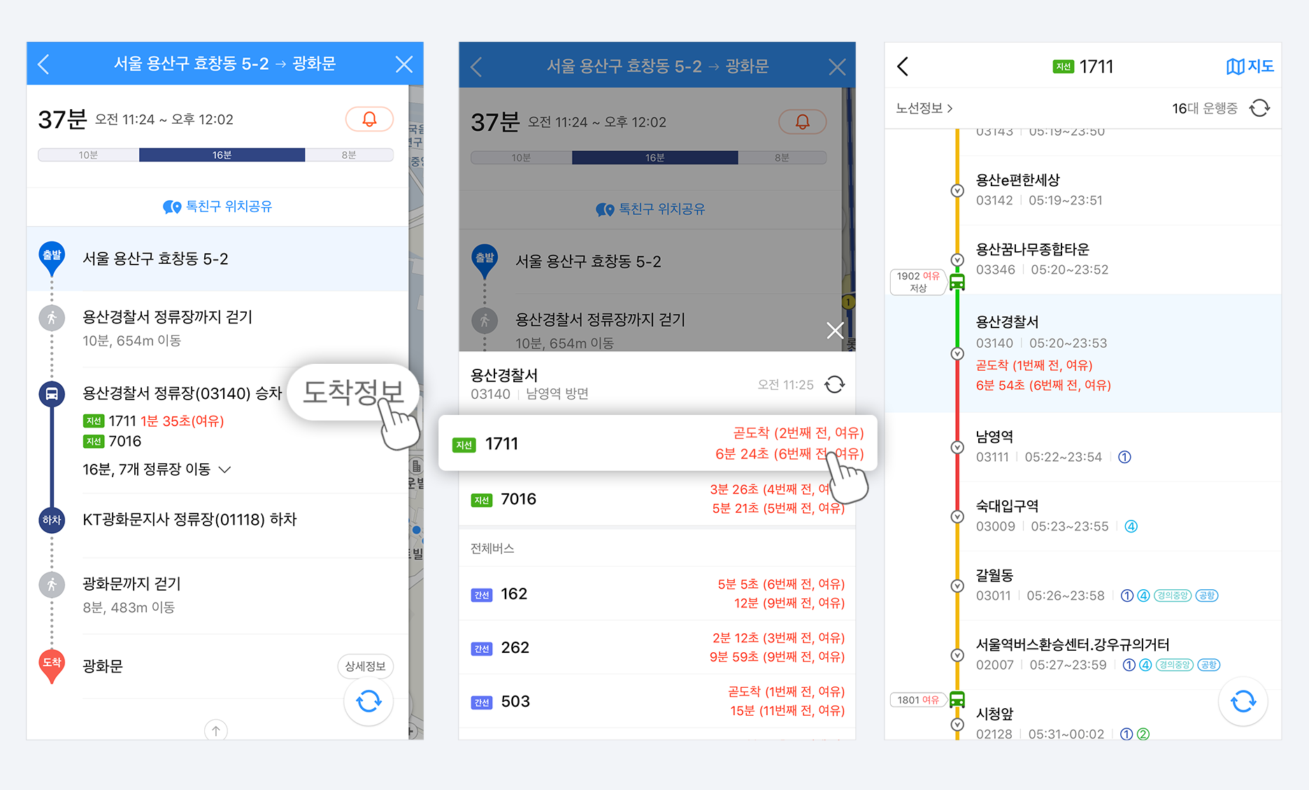 도착정보 버튼을 누르면 실시간 버스 도착정보까지 확인할 수 있으니