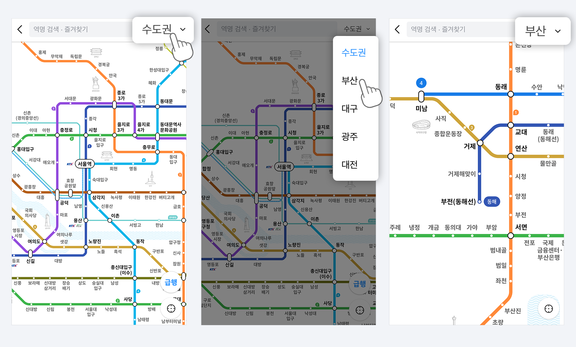 수도권/부산/대구/광주/대전 중에서 노선도를 보고 싶은 지역을 눌러주세요.