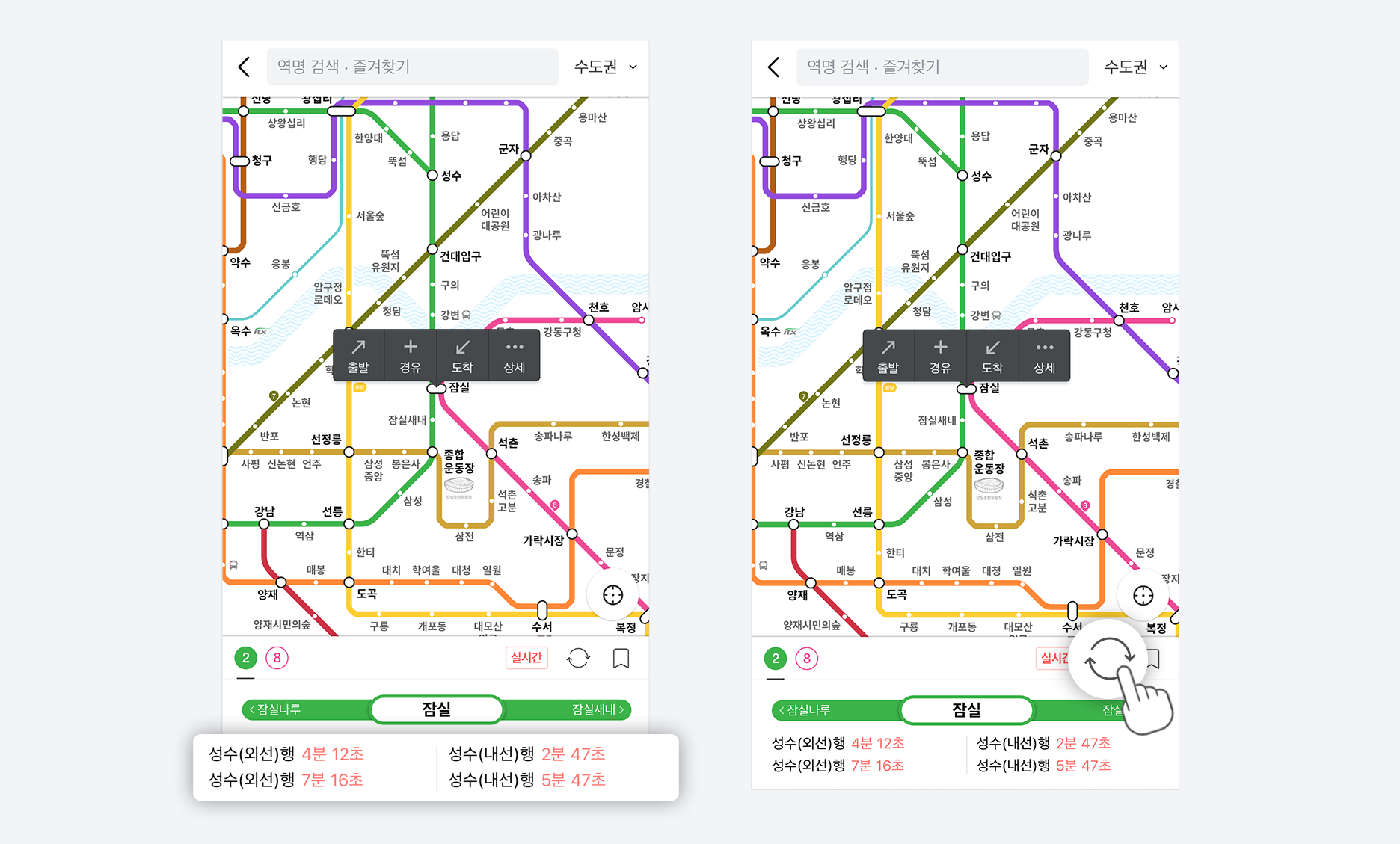 검색한 역 하단 패널에서 실시간 지하철 도착 정보를 바로 확인 할 수 있어요!