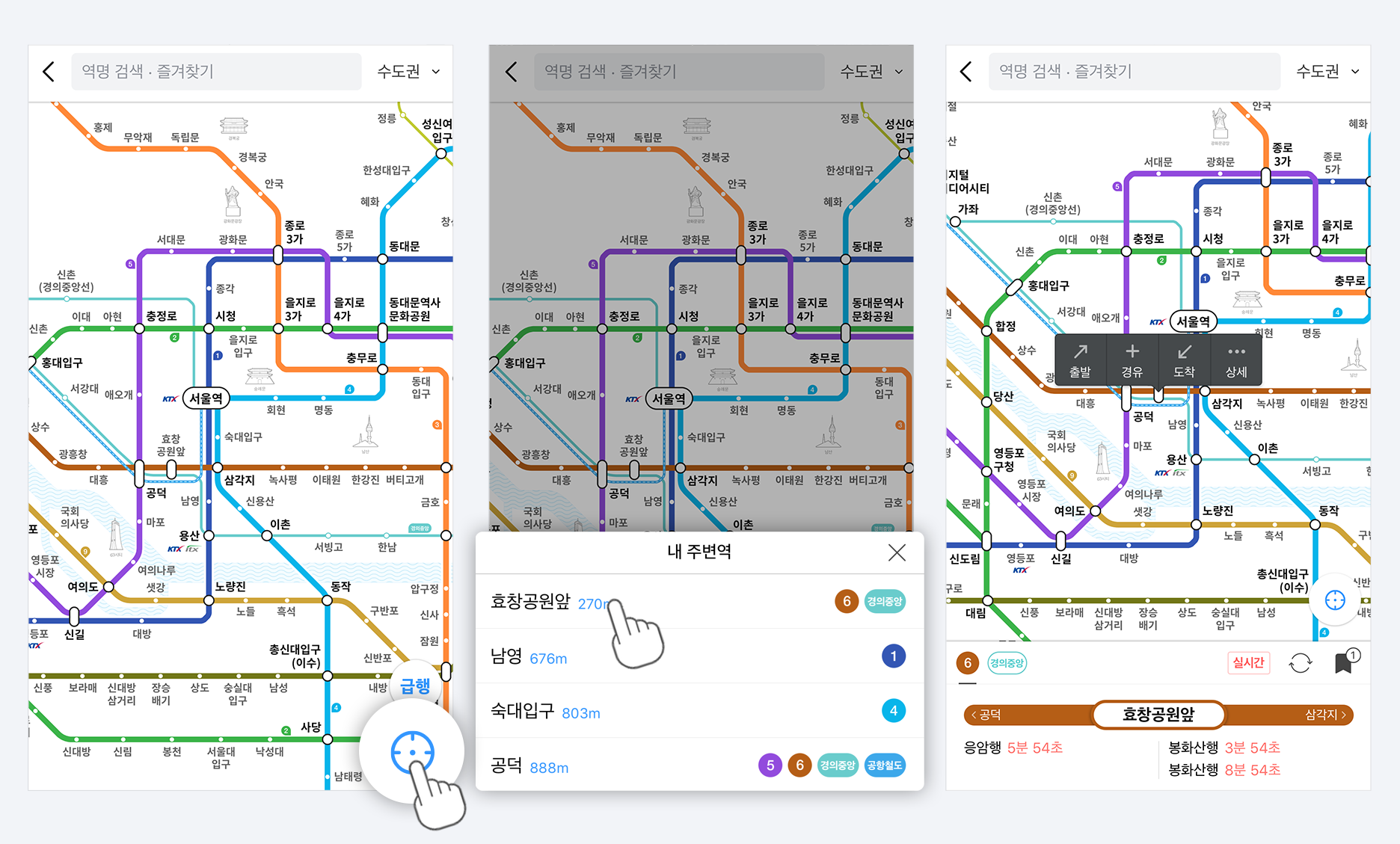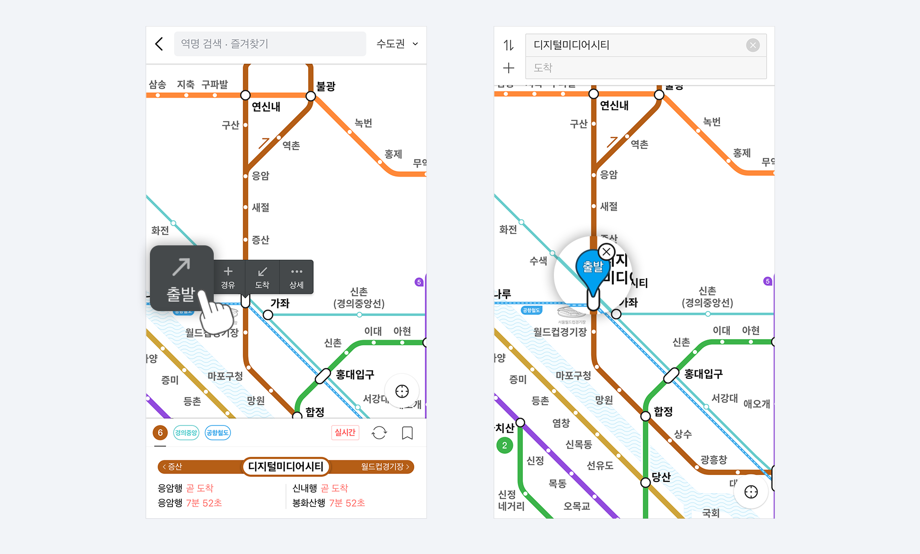 선택한 역 위에 나타난 출발/도착/상세 말풍선에서 출발을 눌러주세요.