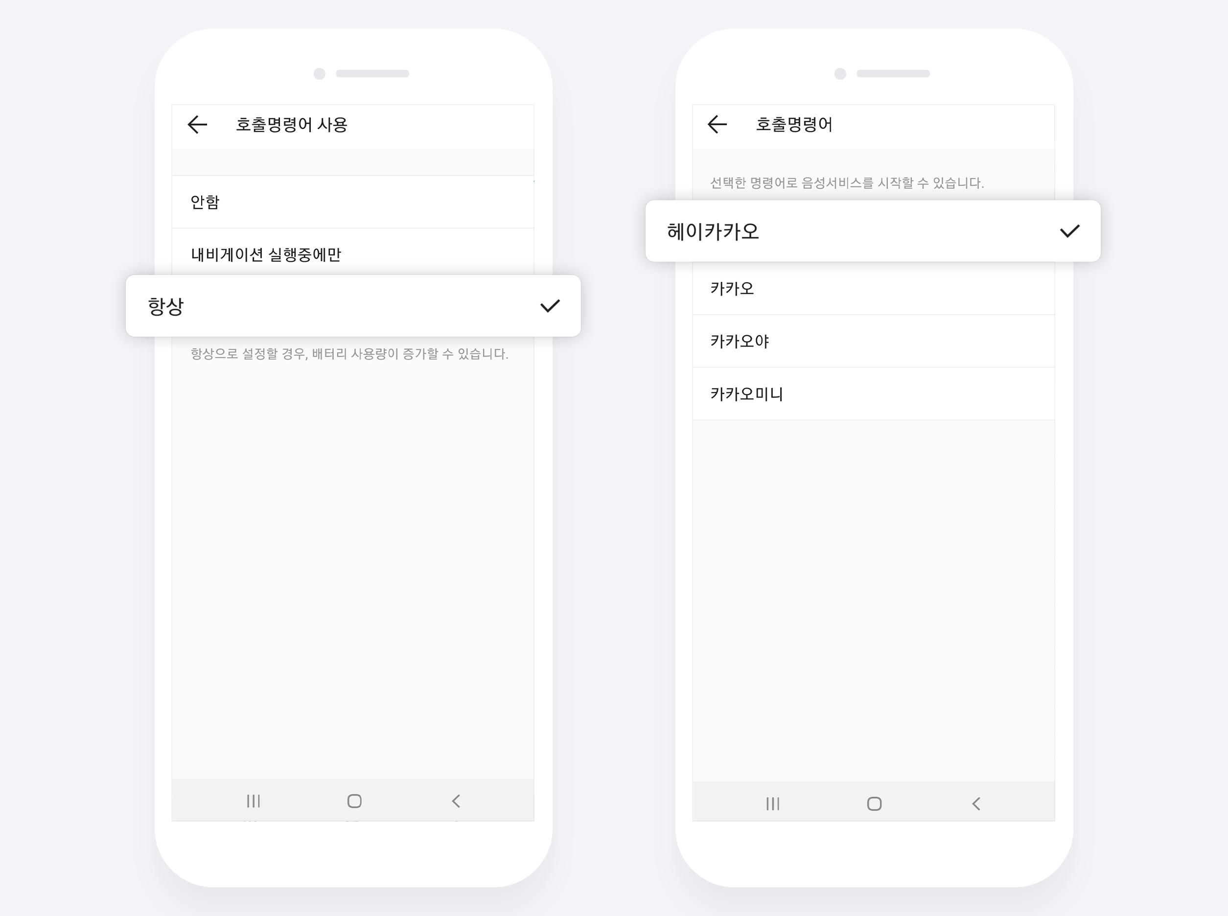- 더보기 메뉴 > 설정 > 앱 설정 > Kakao i 설정 > 호출명령어 사용에서
