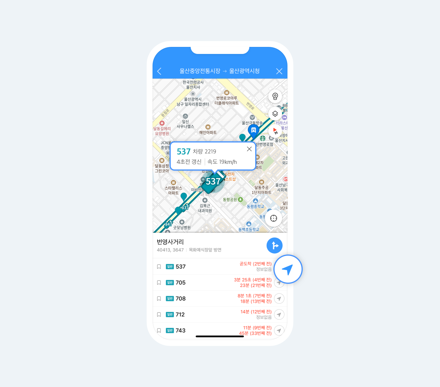 제일 먼저 도착하는 버스의 위치와 속도 정보를 확인하실 수 있습니다.