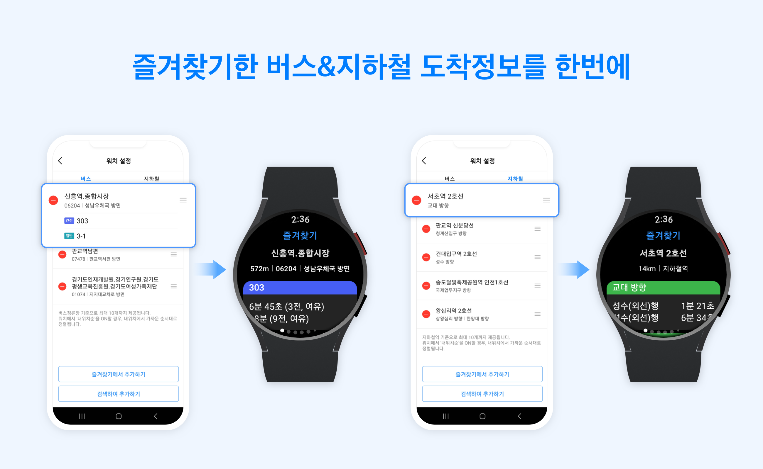 자주 사용하는 버스와 지하철을 워치에 추가해보세요!