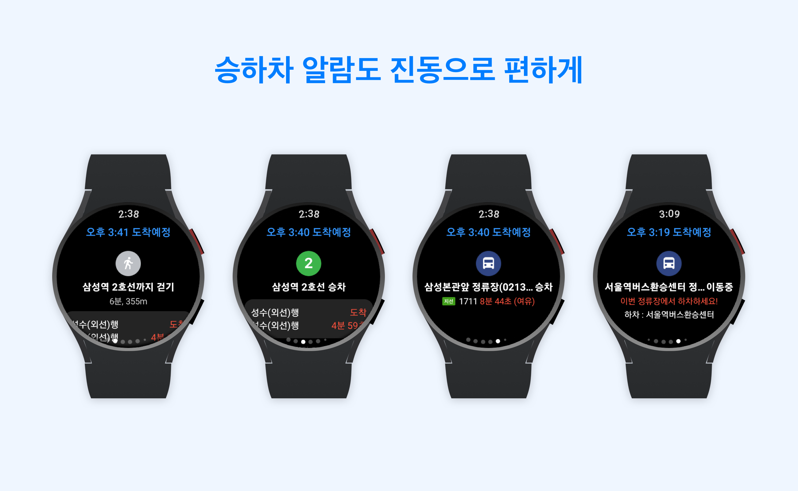워치에서 전체 길안내 구간 확인은 물론, 사용자가 놓치기 쉬운 승차&하차지점을 진동 알림을 통해 안내해드려요.