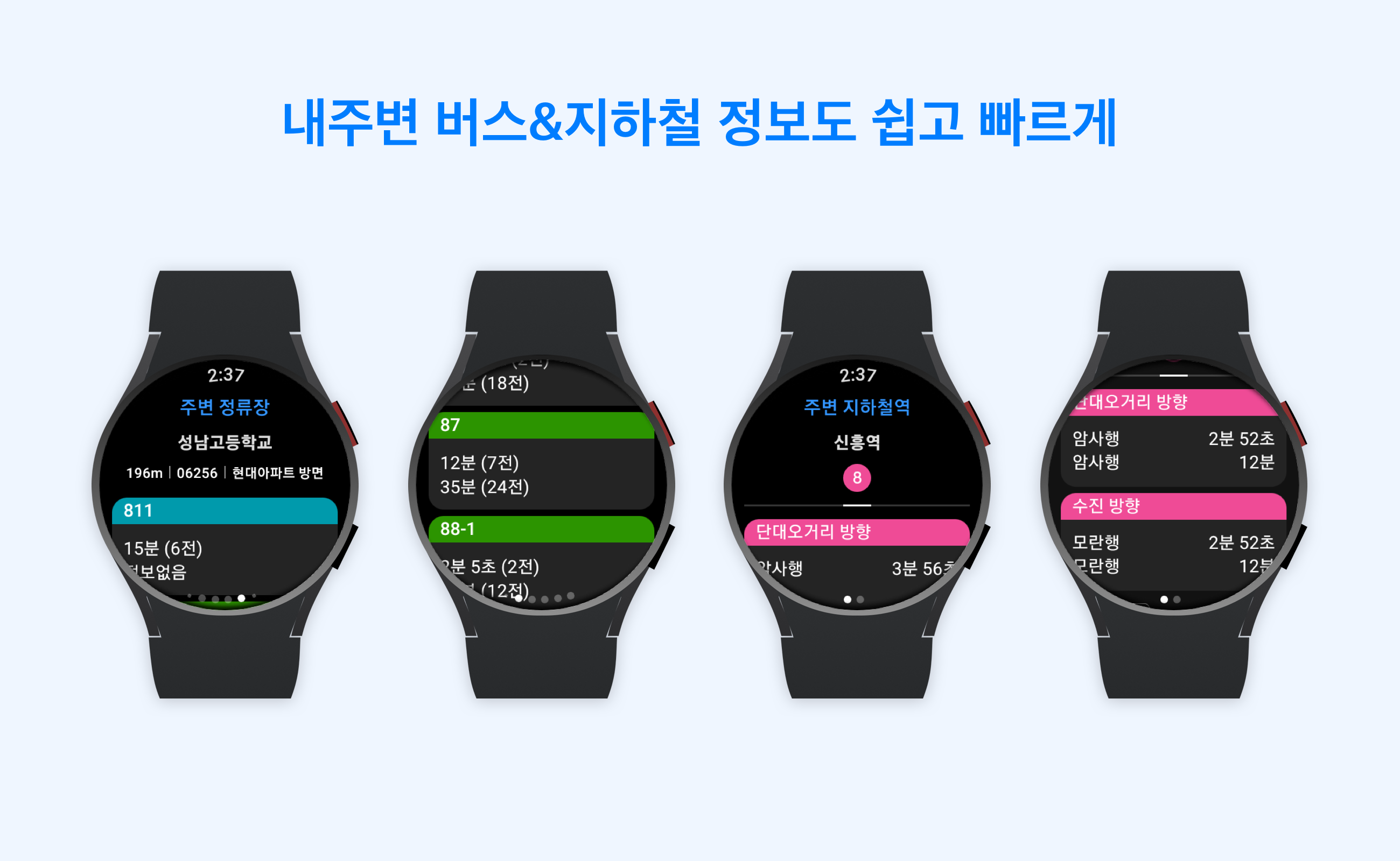 워치에서 버스와 지하철의 실시간 도착정보를 빠르게 확인할 수 있어요.