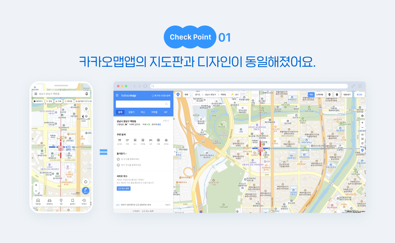 1. 카카오맵앱의 지도판과 디자인이 동일해졌어요.