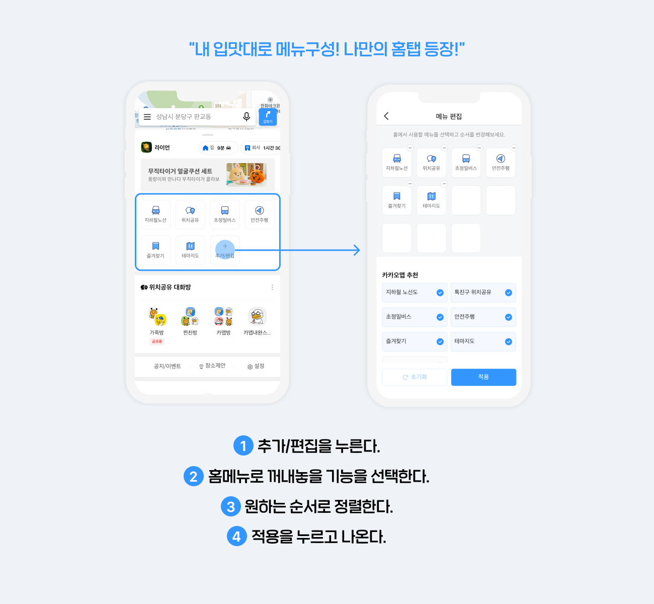 자주 쓰는 기능이나, 왜 이렇게 깊숙이 있지 했던 기능이 있다면, 홈탭에 꺼내 입맛대로 구성해 보세요. 카카오맵을 열자마자 마주하는 그 자리에 여러분이 원하는 메뉴를 구성할 수 있습니다.