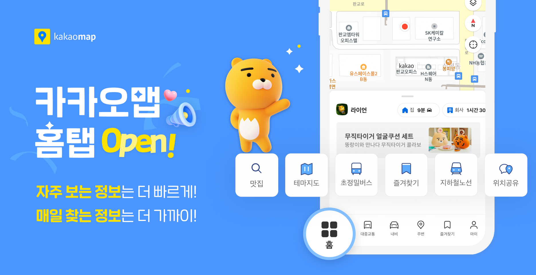 여러분을 가장 처음 맞이하는 첫화면, 홈탭을 준비하면서 고민을 거듭했습니다. 카카오맵을 오래 사용한 만큼 익숙함은 쌓였고, 그럴수록 새로운 변화는 더 크게 체감되실 수밖에 없겠죠.