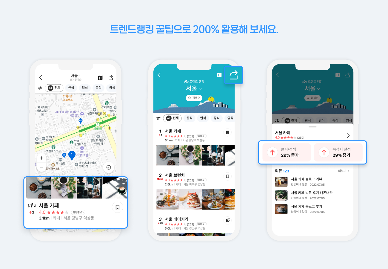 장소상세 랭킹 탭, 주변탭, 초기화면에서도 트렌드 랭킹을 만날 수 있어요.