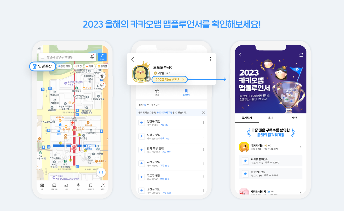 2023년 동안 카카오맵에서 후기, 즐겨찾기, 장소 제안을 통해 카카오맵을 더욱 풍성하게 만들어주신 분 들입니다.
