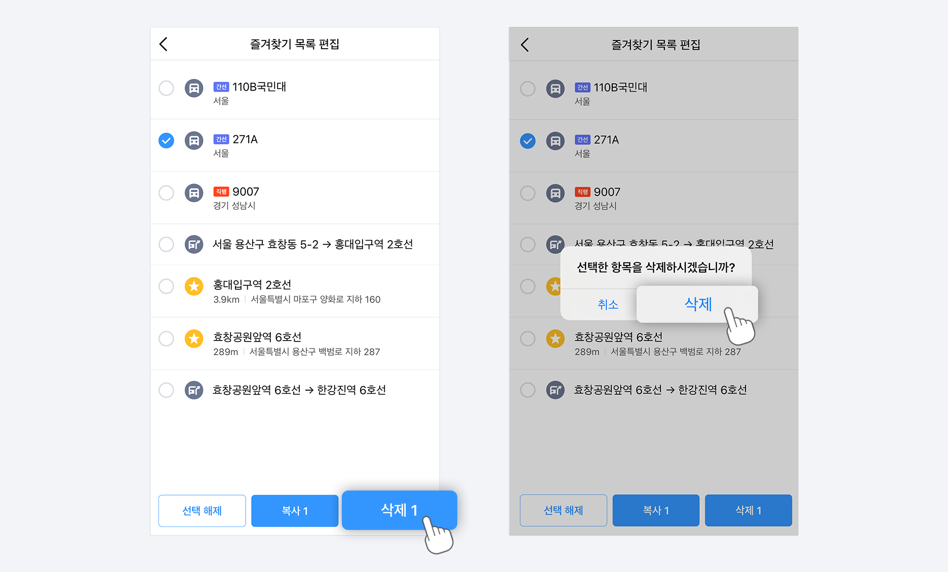 즐겨찾기를 삭제할 장소를 눌러주세요.