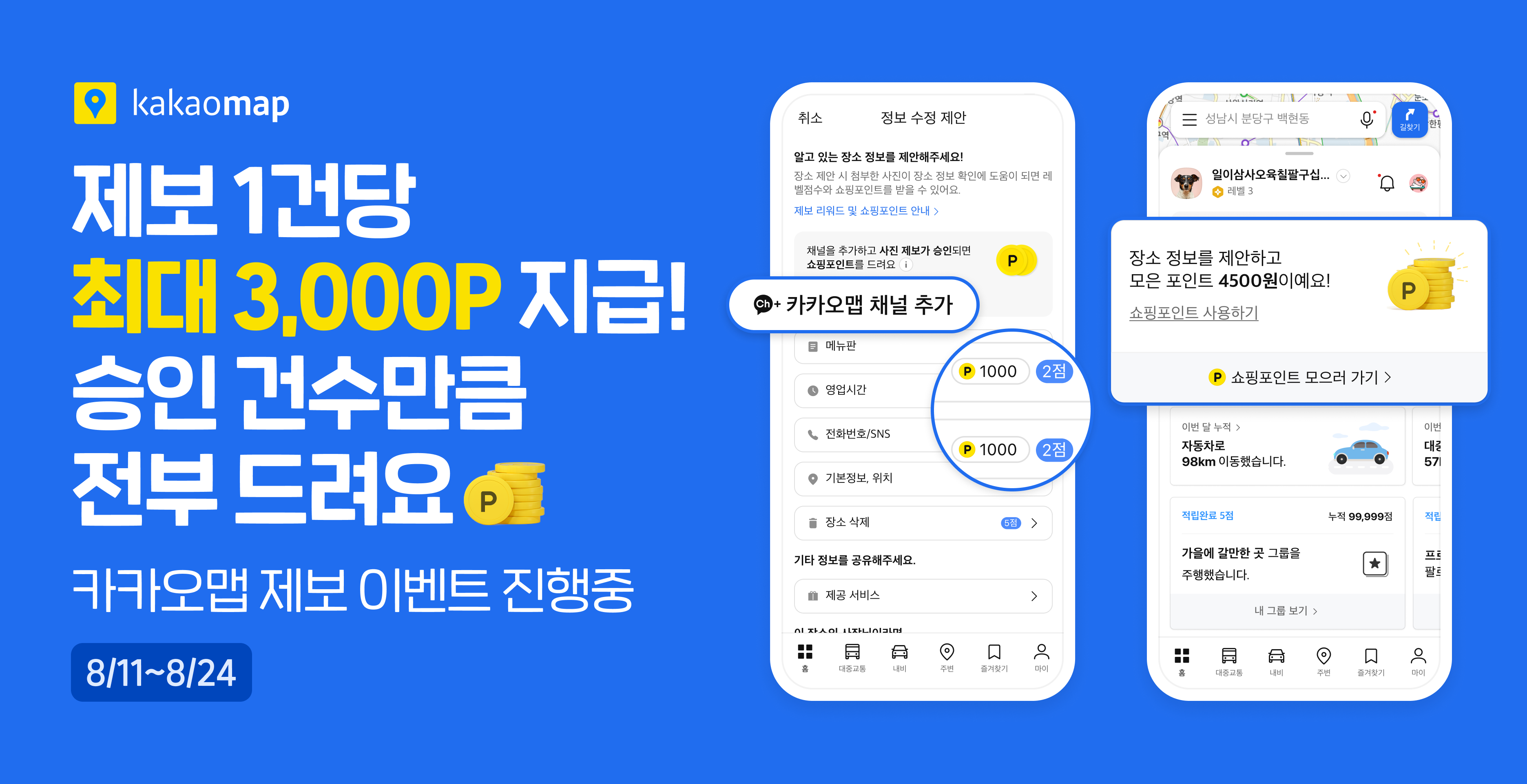 8월 11일(월) ~ 8월 24일(일) 2주간 카카오맵에 정보를 제보하면 승인된 건당 최대 3,000P를 드립니다!