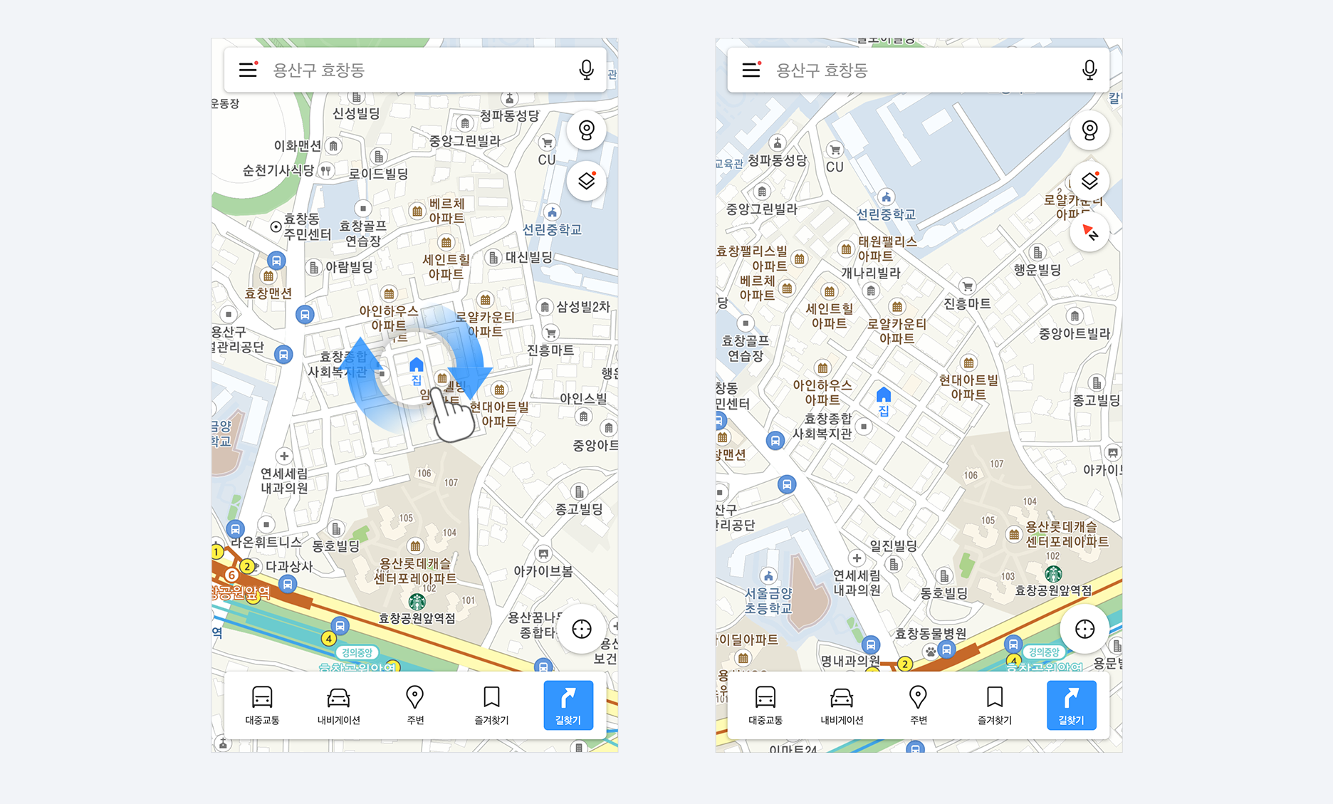 참고로 길찾기 중에도, 검색 결과에서도 지도판 돌리기는 가능하니