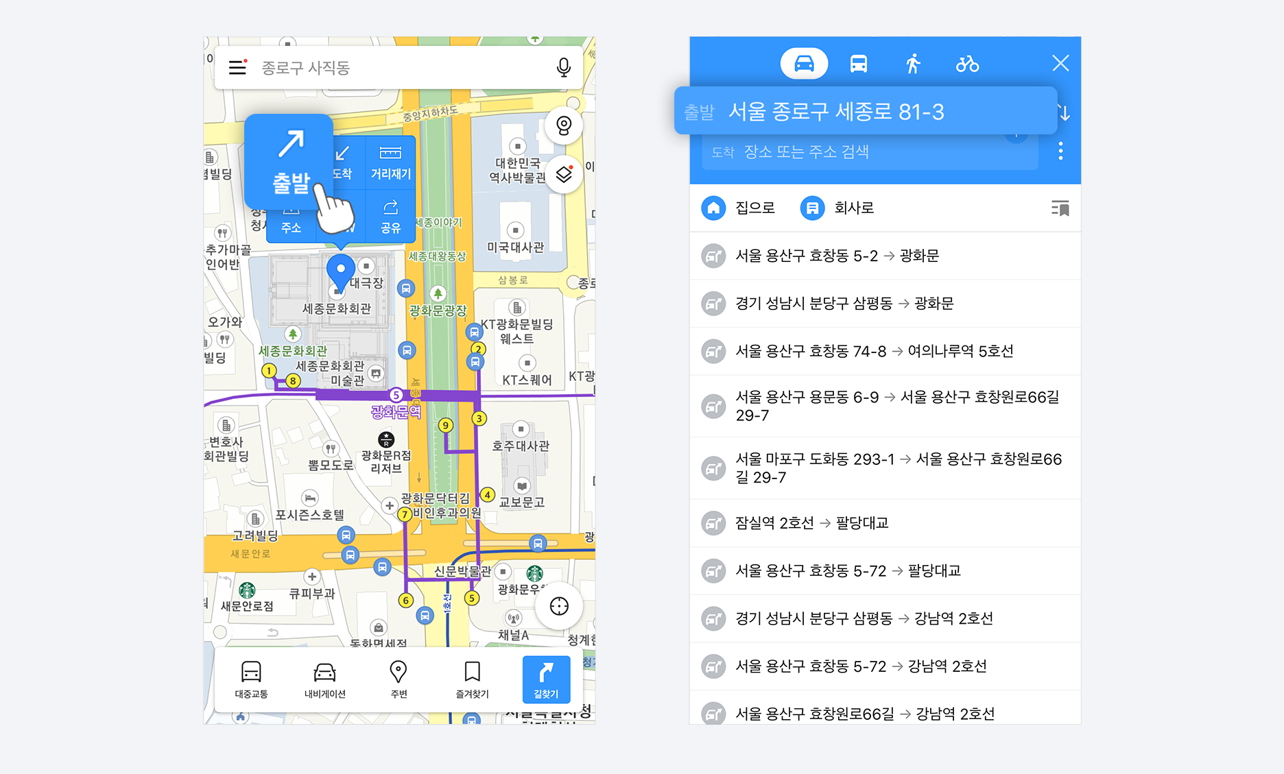 출발을 누르면 원하는 위치가 자동으로 출발지로 입력됩니다.